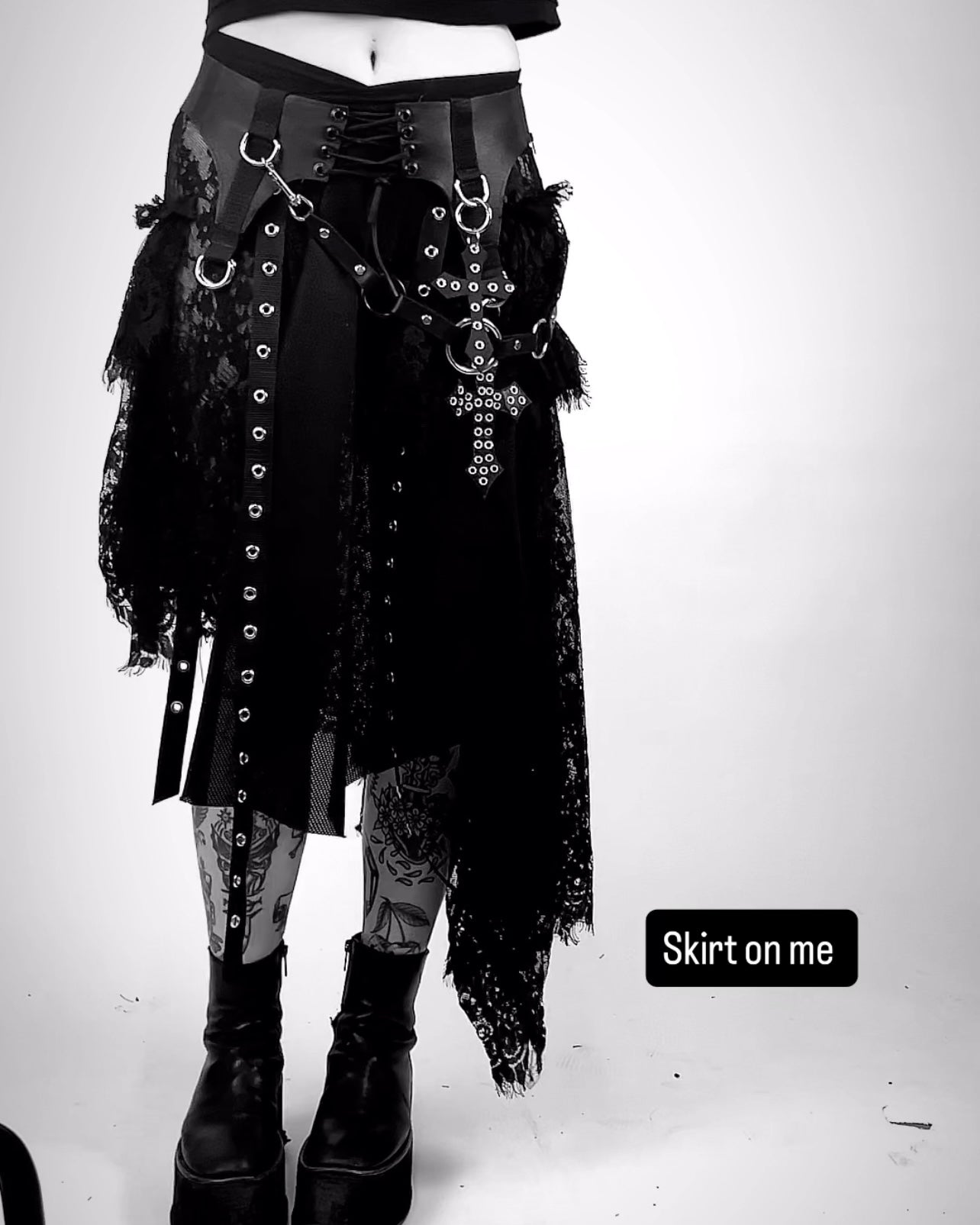 My favorite layering skirt made with multiple layers of black fabric, mesh, and lace fabric. Jersey knit bamboo cotton waist band that has stretch and is so flattering!