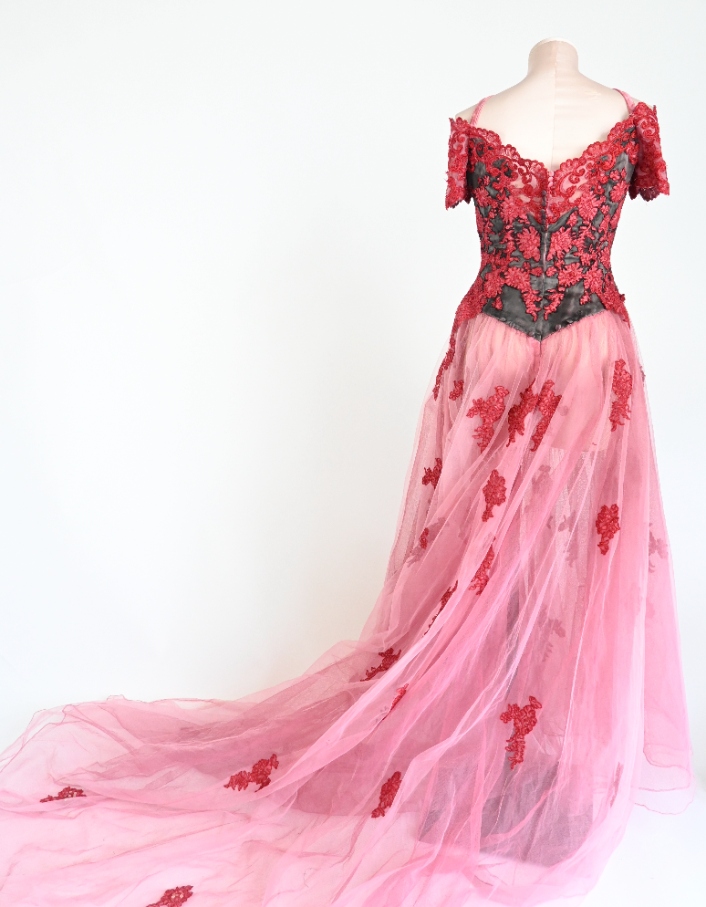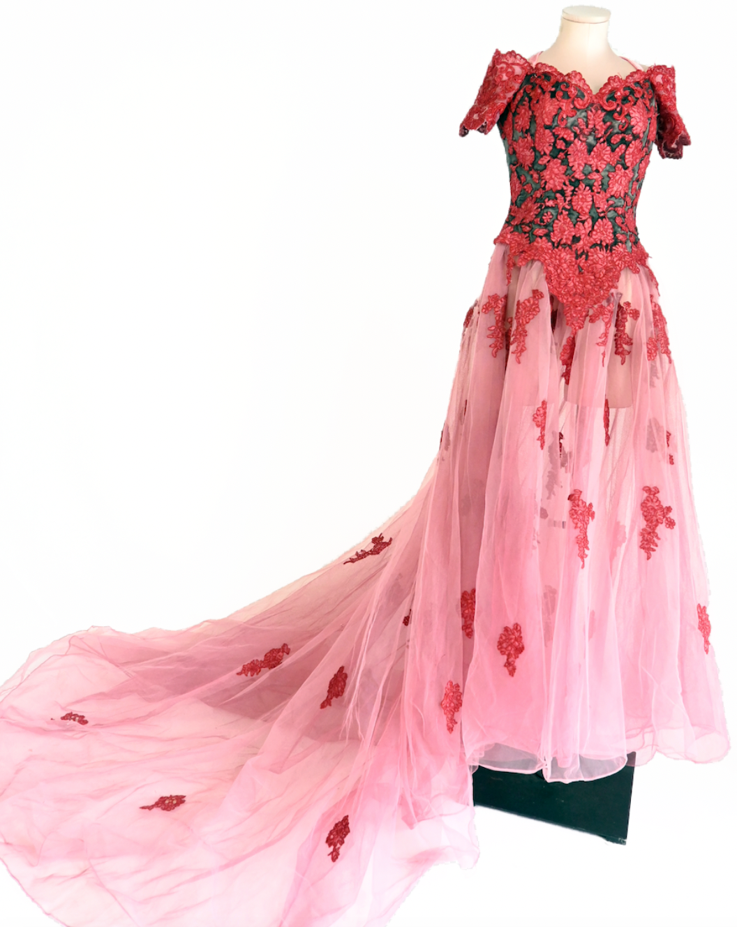 This gown was polyester, nylon, and silk. The appliqué’s were silk and took the dye the best. The background ids polyester and did NOT. So I hand painted the black background, which was totally worth it! I took out 3 layers from the bottom, and re applied the appliqués to the nylon that dyed the best.