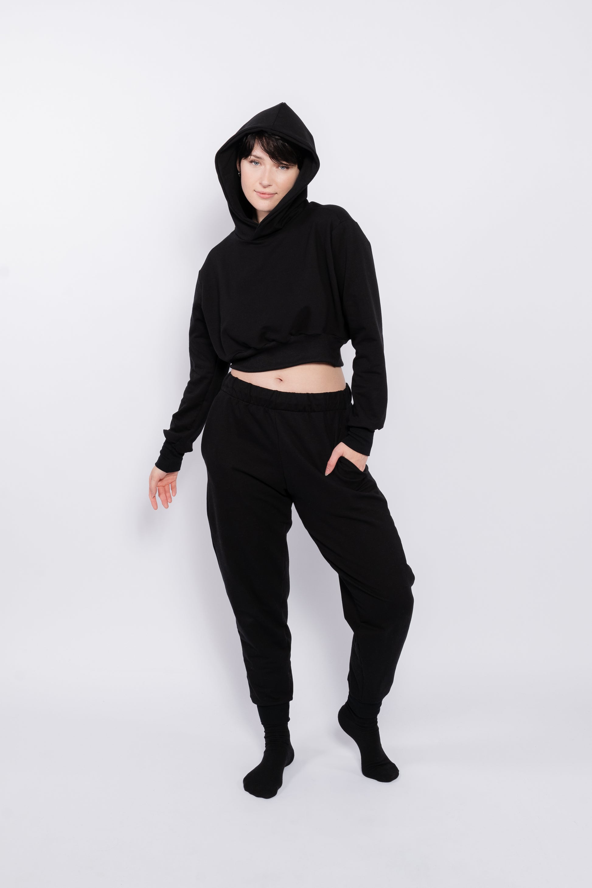 Black french terry = 95% Cotton, 5% Spandex 8oz French Terry (sourced from a sustainable company based out of Canada)